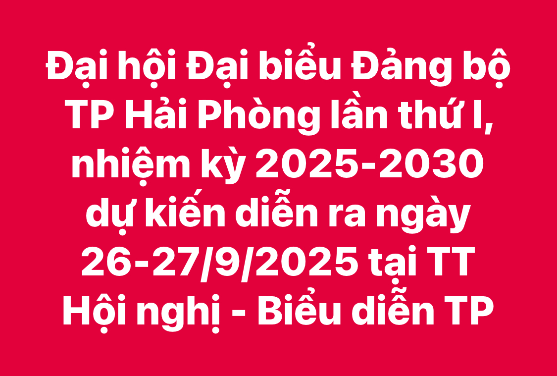 🔴 ️Đại hội Đại biểu Đảng bộ thành phố Hải Phòng lần thứ I, nhiệm kỳ 2025-2030 dự kiến diễn ra ngày 26-27/9/2025 tại Trung tâm Hội nghị - Biểu diễn thành phố (Khu đô thị Bắc Sông Cấm, phường Thủy Nguyên, thành phố Hải Phòng)