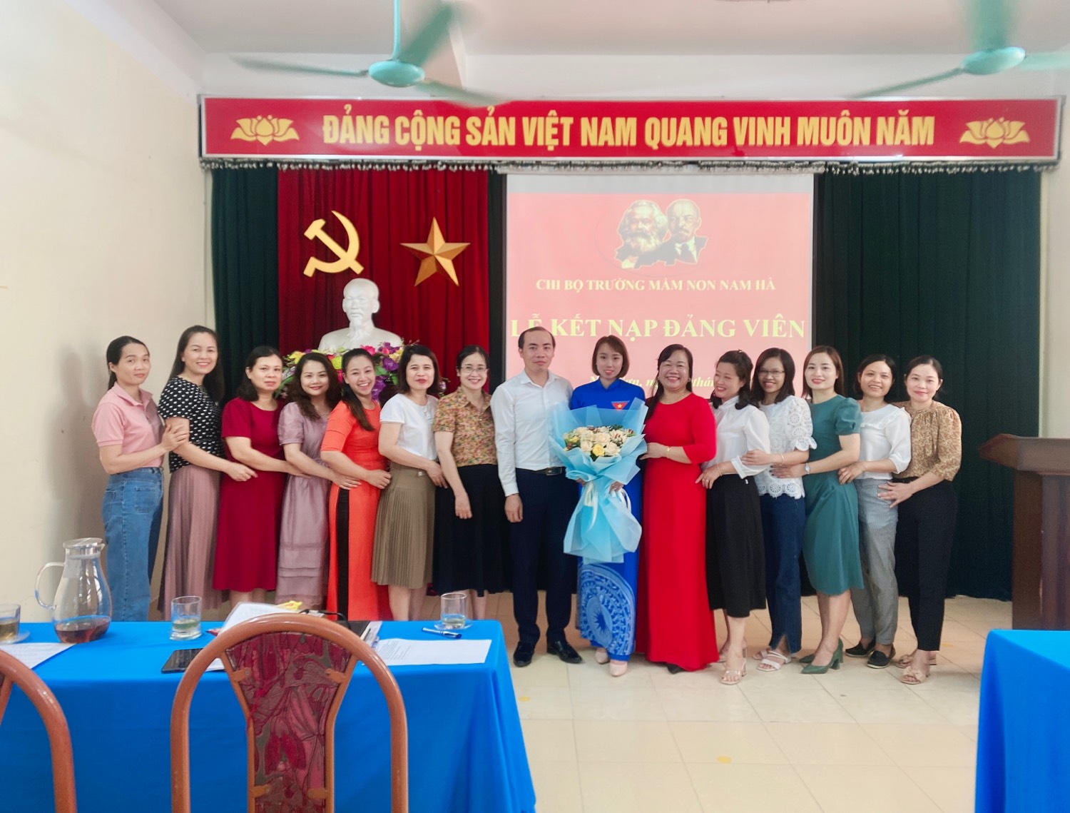 Buổi lễ kết nạp Đảng viên mới kết thúc trong bầu không khí vui tươi, đầy hứa hẹn, một năm thử thách không ngừng phấn đấu của đồng chí: Bùi Thị Anh để trở thành đảng viên chính thứ c của chi bộ trường Mầm non Nam Hà.